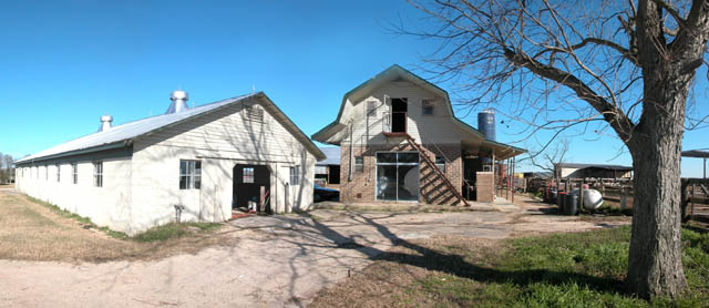 The heifer barn is on the right. The milking barn is in the center of the frame. -