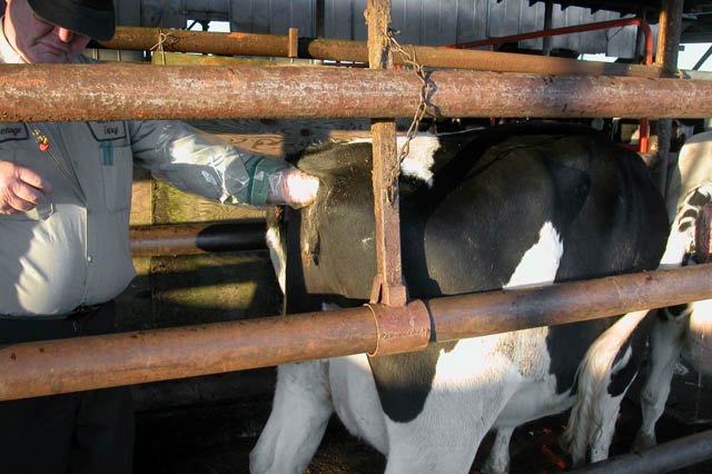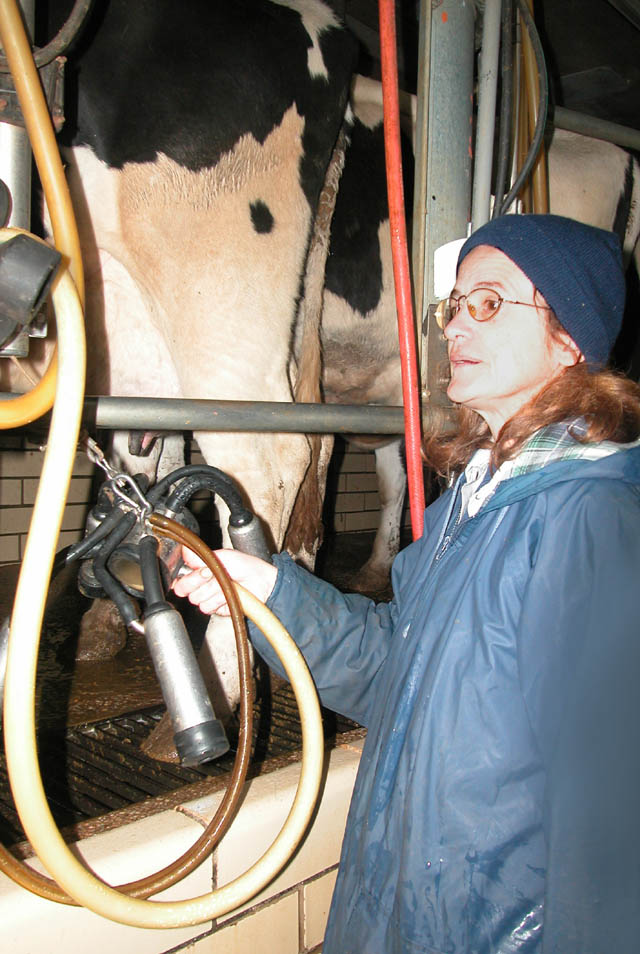 Jan McCune places the milking machine on the cow’s udders. The machine pulls a 30 pound pressure to complete the evacuation process in 5 to 15 minutes depending on the quanitity of milk. -