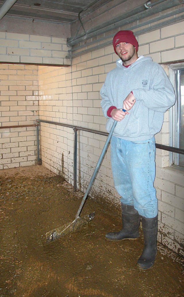 The cows are leaving the milking barn. They are milked in shifts of 16 cows. The entire herd is processed between 1:40 a.m. and 6:30 a.m. and again in the afternoon beginning at 1:00 p.m. finishing around 5:30 p.m.. -