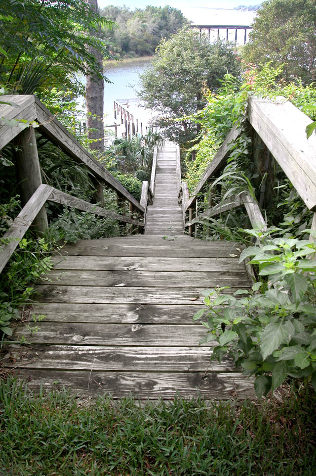 A walkway leads from the backyard to the boat house on the shore of Pensacola Bay.