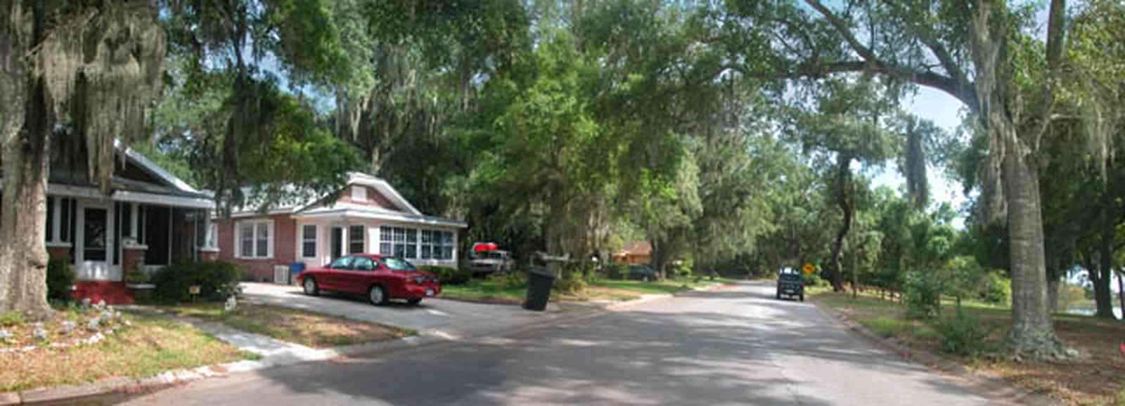 • East-Pensacola-Heights:-118-Bayou-Blvd_05.jpg:  craftsman cottage, spanish moss, bayou texar, oak tree, red brick house