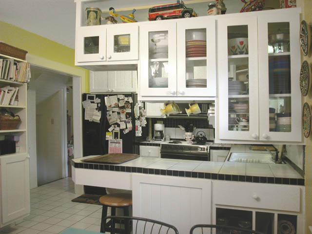 The stair-step kitchen cabinets act as a room divider and provide a view through to the living area.