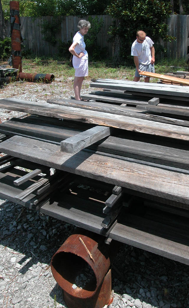 Mrs. Pete Baucum searches the stacks for the perfect pieces of curly pine boards for a cabinet.