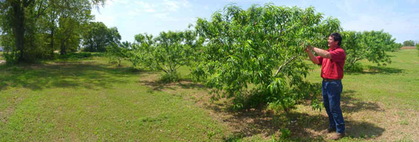 Bruce Holland is seen in the foreground of his peach orchard in northwest Florida. The trees have been planted in symmetrical rows every year for the past six years. The orchard has approximately 200 trees, all bearing fruit.