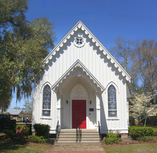 • Milton:-Historic-District:-St.-Mary-Episcopal-Church_04.jpg:  gingerbread trim, victorian architectural style, dogwood tree, oak tree, spanish moss