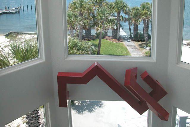 • Navarre:-7332-Grand-Navarre-Blvd_10.jpg:  art deco house, view of bay, santa rosa sound, pier, dock, deck, window, sculpture