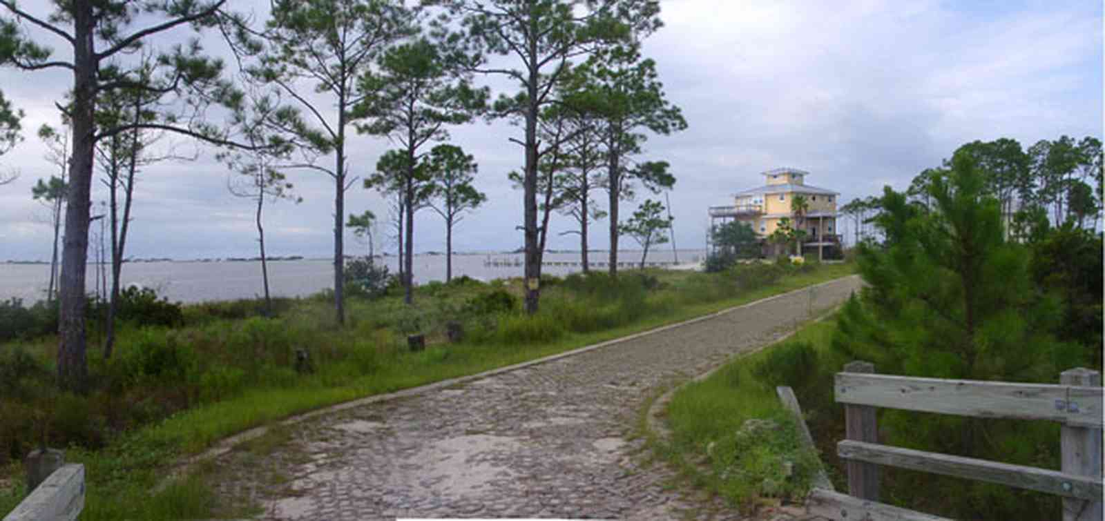 The driveway is built with concrete blocks to form a pervious drainage surface adjacent to the wetland area on the right of the frame. A southwest view of the house can be seen in the distance.