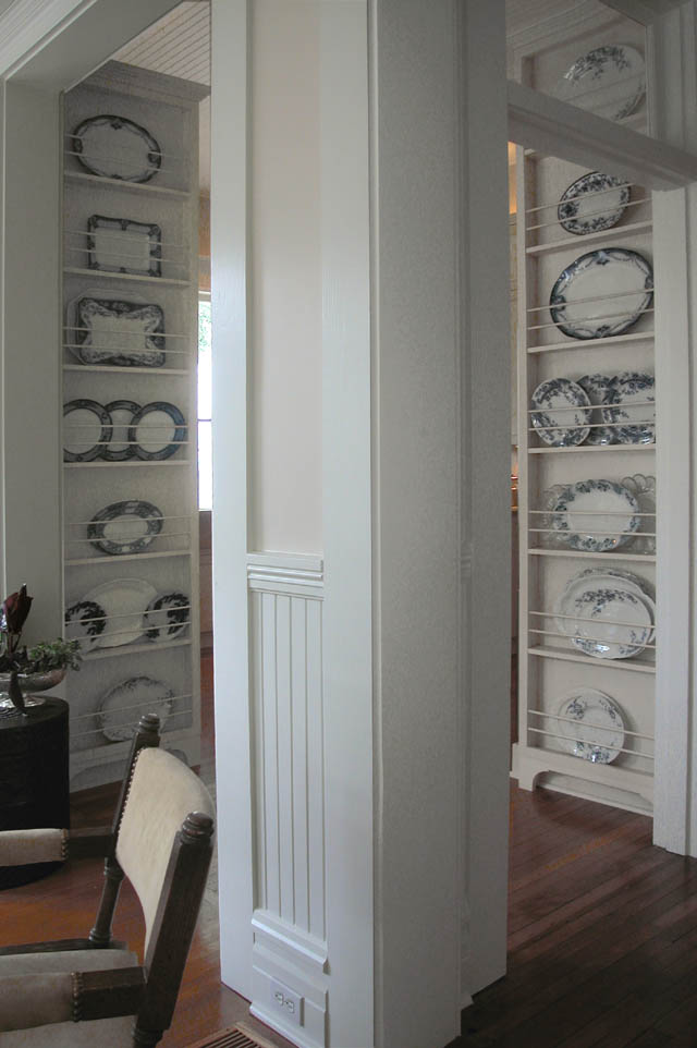 • North-Hill:-116-DeSoto-St_02h.jpg:  blue willow china, heart pine floors, kitchen, wainscotting, dish rack, china display