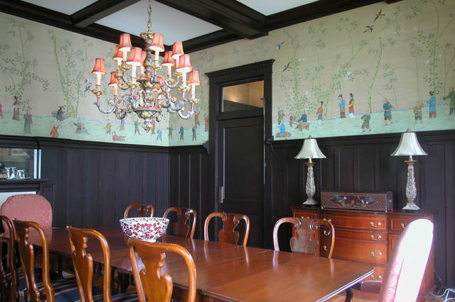 • North-Hill:-116-DeSoto-St_02m.jpg:  formal dining room, silk wallpaper, chinese wallpaper design, chandelier, buffet, coffered ceilings, wainscotting