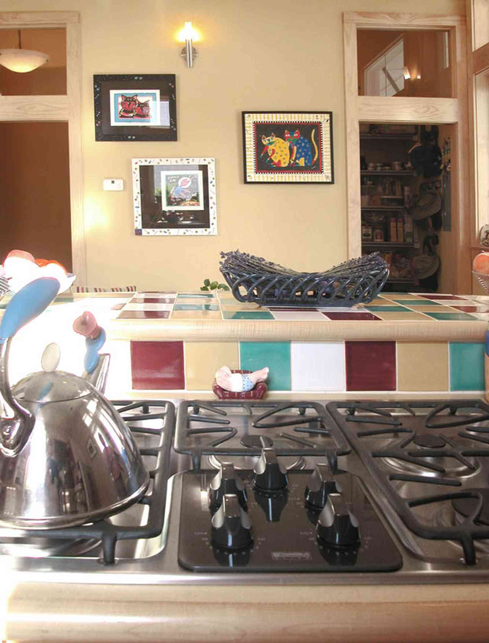 • Aragon:-649-Aragon-Street_21.jpg:  gas range, counter top, ceramic tile, tea kettle, transom, pantry, kitchen,