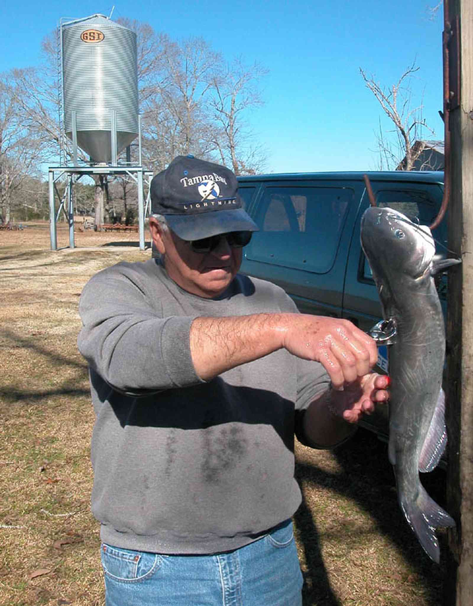 George Carpenter begins a demonstration of cleaning catfish by cutting off the spiny central fin.