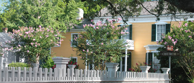 In this view, the Dorr house can be seen across the picket fence of Old Christ Church.