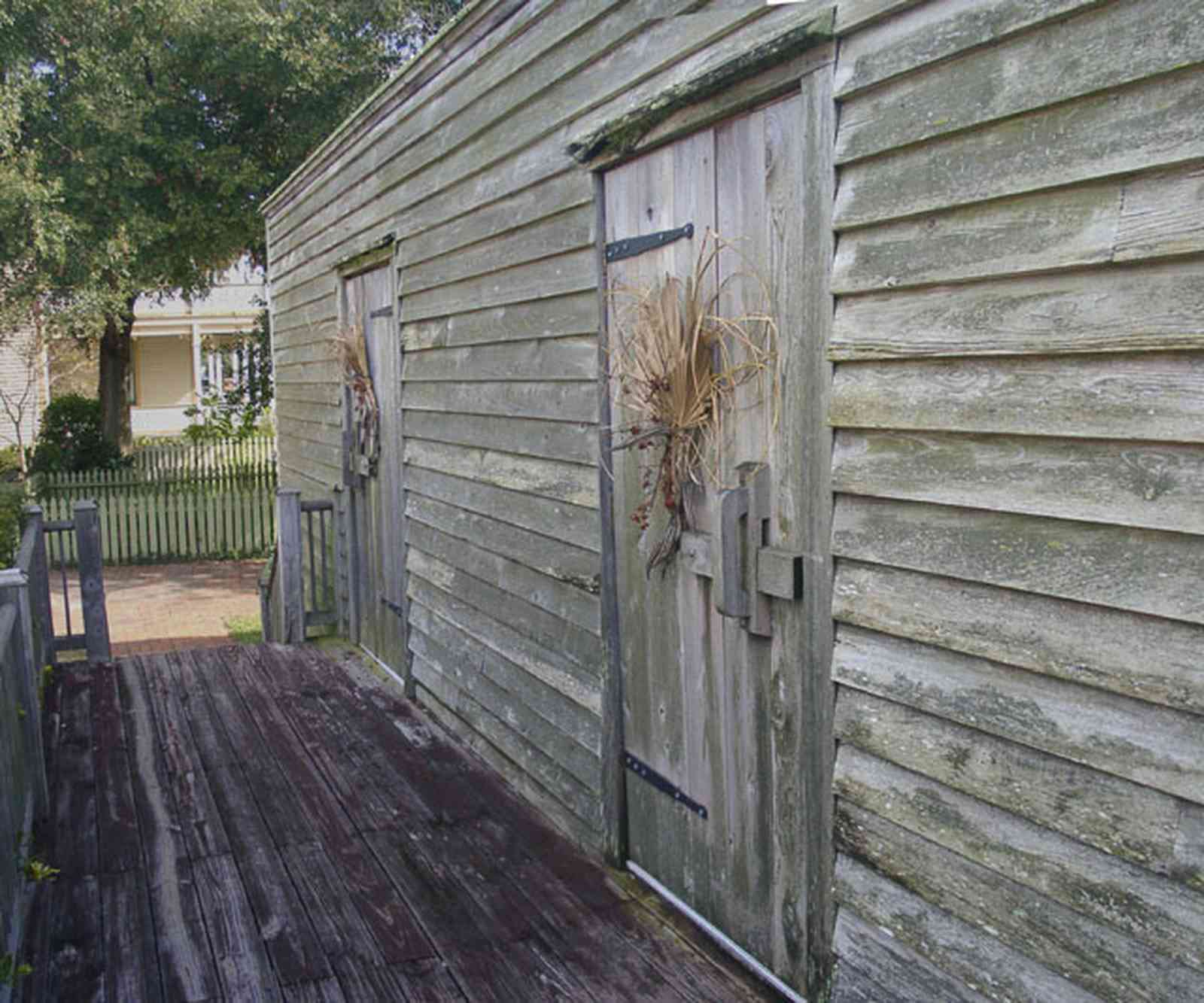 From the vantage point of the back porch of the cottage, the Lear House can be seen through the trees. The houses are separated by a picket fence.