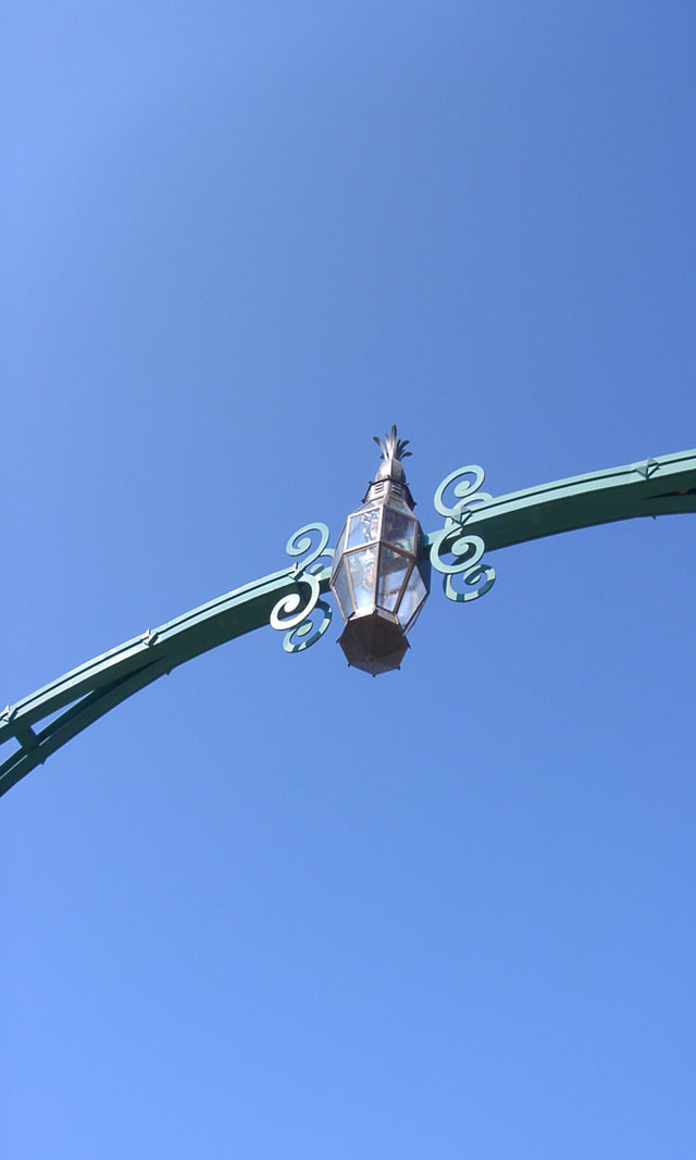 There is a central arch over the east entrance to the Aragon Development on Romana Street.