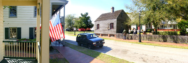 The viewer faces west from the vantage point of the porch. The Julee cottage is center frame and the side garden of the Lear House is on the right.