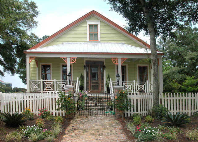• Pensacola:-Seville-Historic-District:-202-Cevallos-Street_01.jpg:  picket fence, brick sidewalk, oak tree, palm tree, front porch, 4 square georgian style