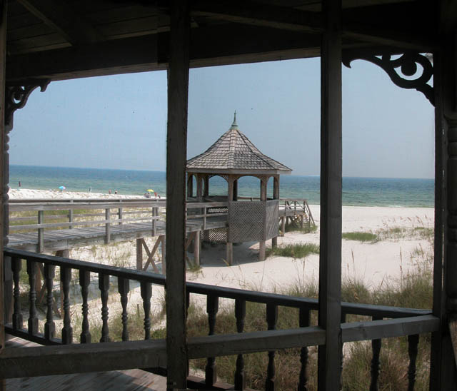 • Perdido-Key:-Gothic-House_08b.jpg:  porch, screen porch, summer house, gazebo, cedar shake roof, walkway, pier, deck, gulf of mexico, emerald water, dunes, sea oats, beach