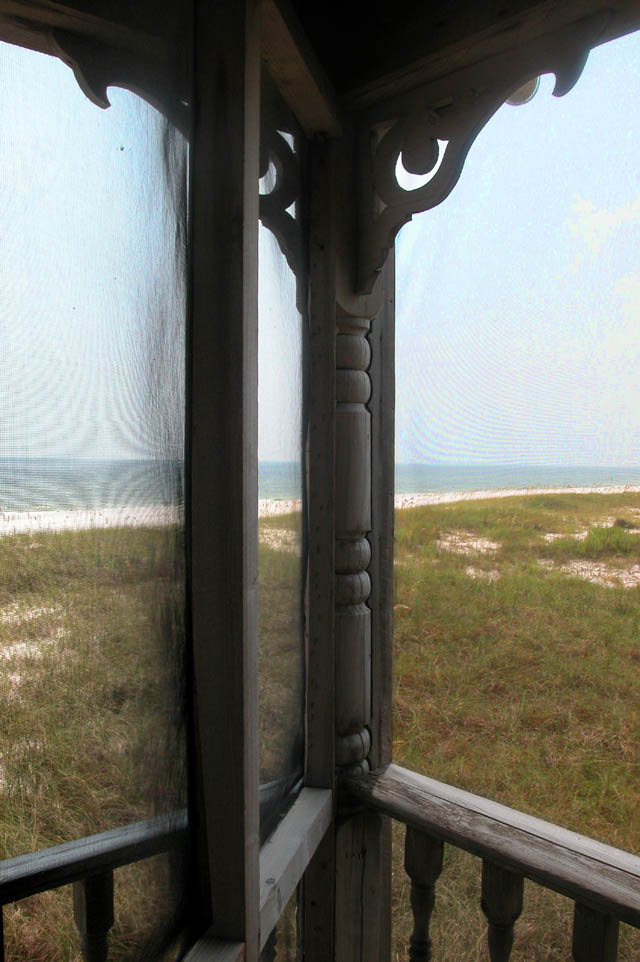 • Perdido-Key:-Gothic-House_08e.jpg:  porch, screen porch, summer house, gazebo, cedar shake roof, walkway, pier, deck, gulf of mexico, emerald water, dunes, sea oats, beach