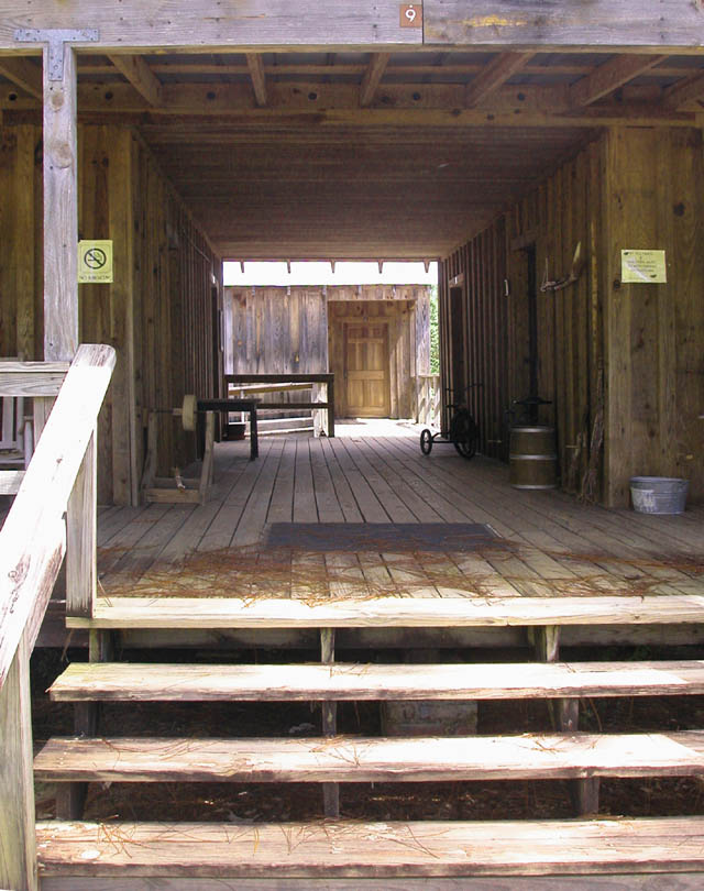 With broad porches and this "dog trot" breezeway, the interior space was somewhat insulated for direct sunlight. It also served as a sheltered workspace. The kitchen building is at the end of the walkway.