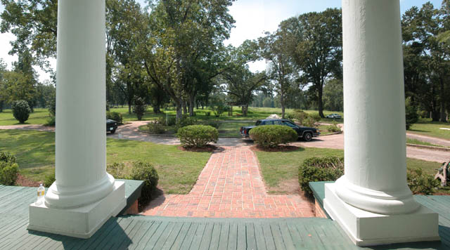 The house is surrounded by groves of hardwood trees. -