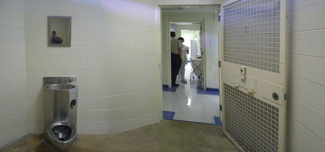 The bathroom is adjacent to the clinic area in the infirmary.
