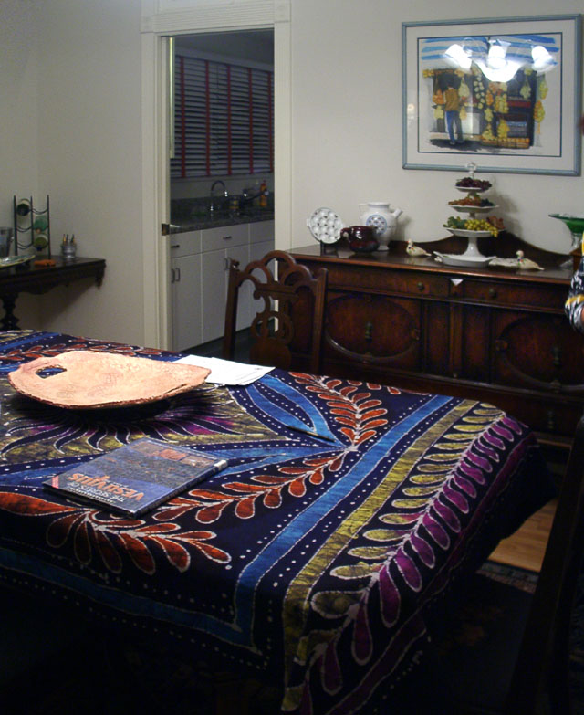 The bay window of leaded glass with stained panes is very unusual. It imparts a light airy feeling to the room.