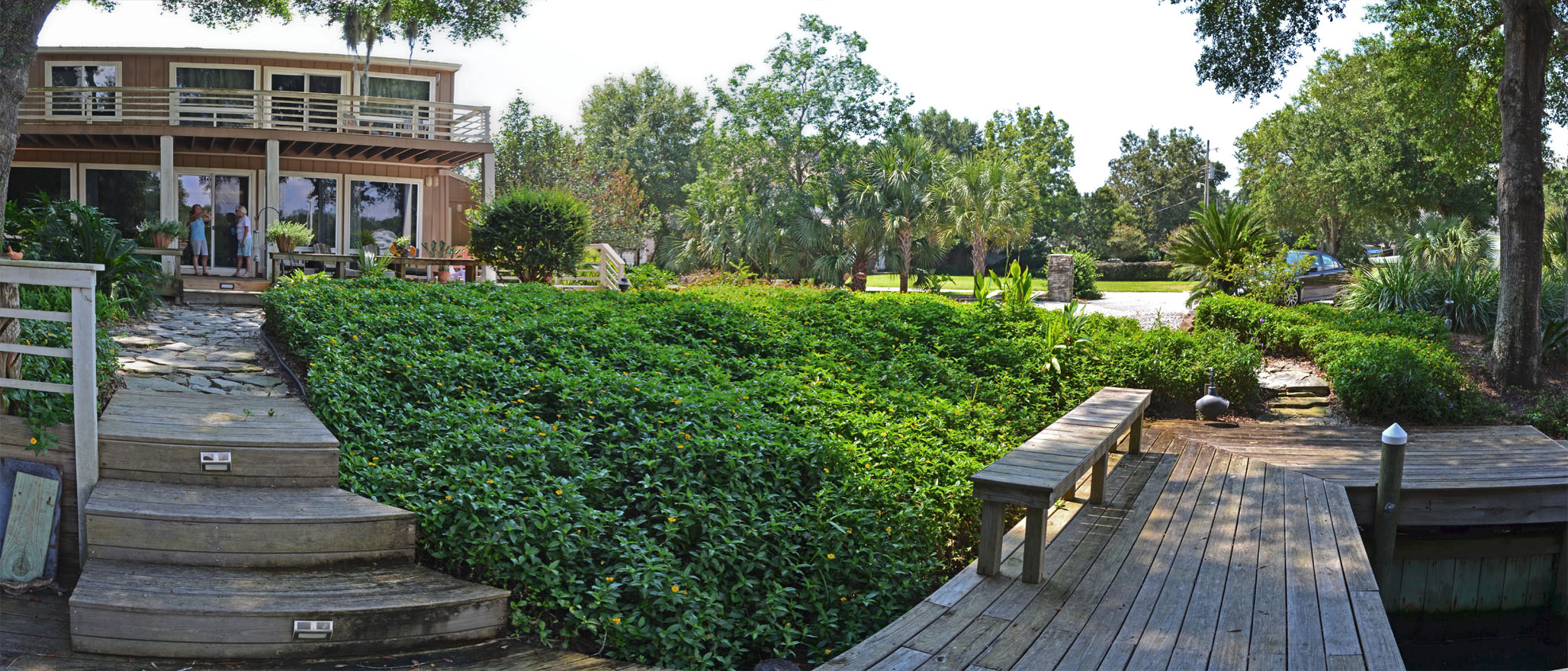 A walkway leads from the backyard to the boat house on the shore of Pensacola Bay.