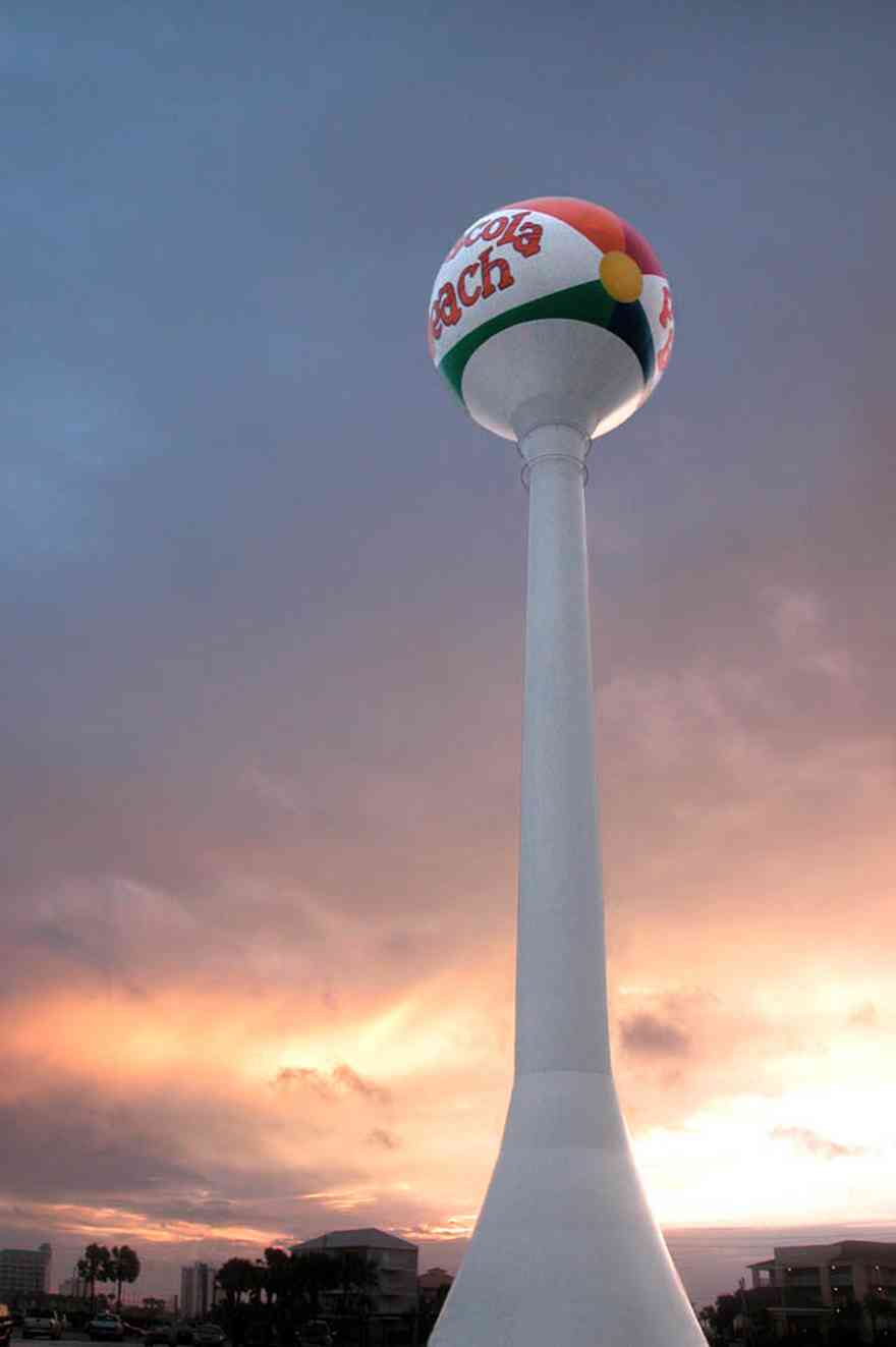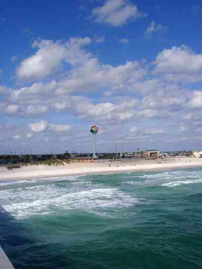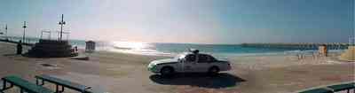 The car is located in the center of the area in front of the seating. The surface is tiled. The Gulf Fishing Pier can be seen on the right. -