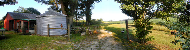 The lean-to on the side of the barn is used as a chicken coop.
