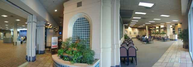 Escalators transport passengers from the first floor ticketing area to the concourse. The parking garage entrance can be seen to the right of the photograph.