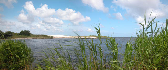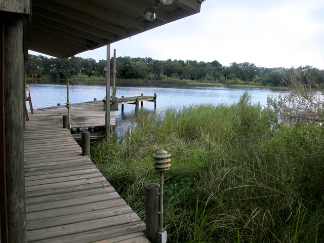 The back porch view shows the shallow width of Dead Man's Island. The bay side of the island has narrow dune formations. Sea grasses and trees are the vegetation on the channel side of the island.