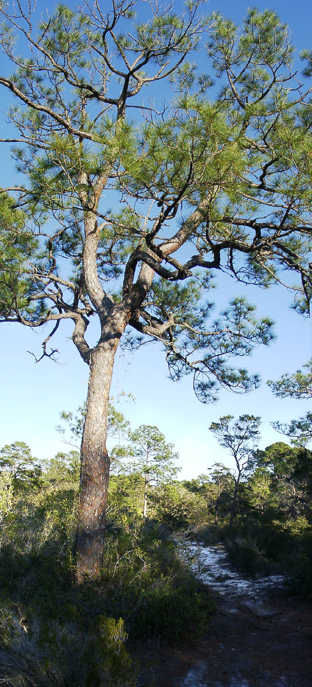 In contrast to the species of pine shown below, the sand pine is much shorter. Its form can be twisted with lower branches growing close to the ground.