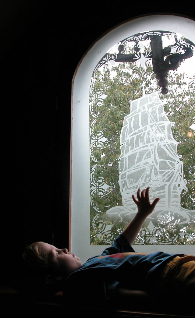 The ship in the east window of the childrens attic playroom shows an etching of one of the sailing ships that frequented Pensacola in the latter quarter of the 19th century to export