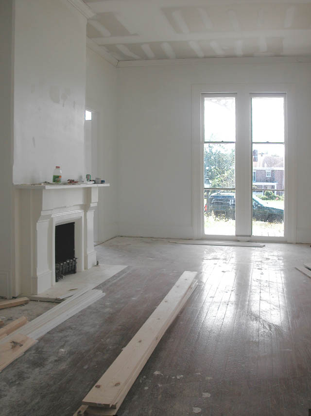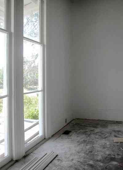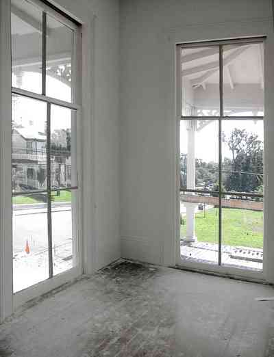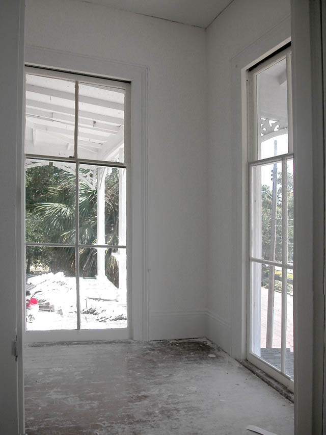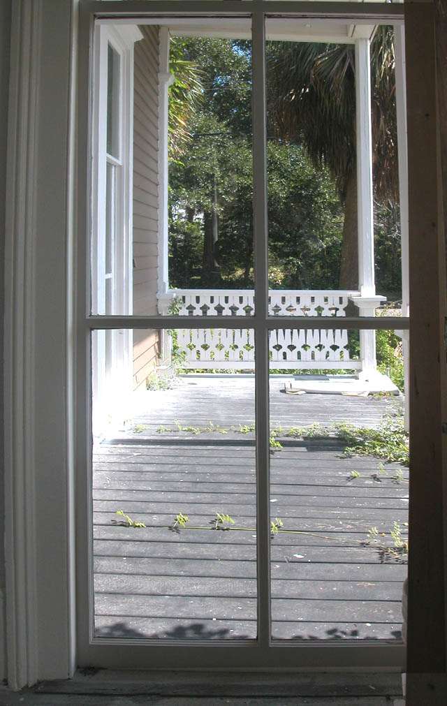 There is a front porch set back on the east side of the facade. This is a view from the central hall. -