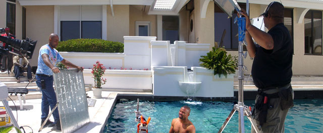 Keith Washington positions a shiny board so that light is reflected on Roy Jones in the swimming pool.