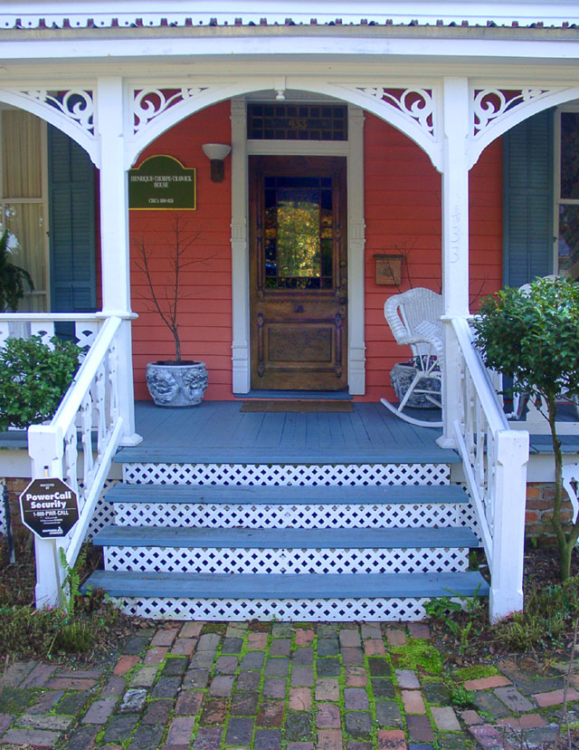 An apron porch with an overhang helps keep the house cool during the hot Gulf Coast summers.