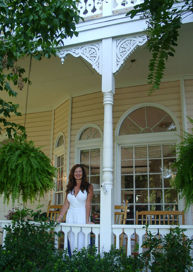 The view of the downstairs porch shows the rich detail of the Victorian molding.