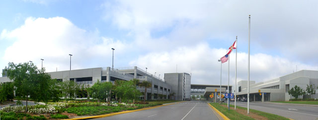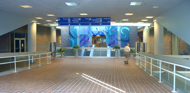 Escalators transport passengers from the first floor ticketing area to the concourse. The parking garage entrance can be seen to the right of the photograph.
