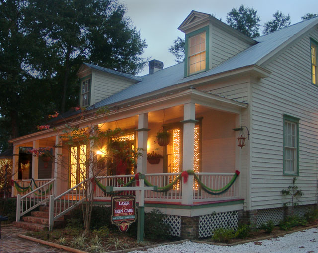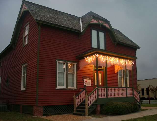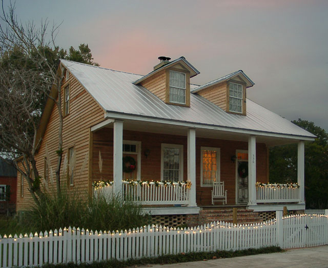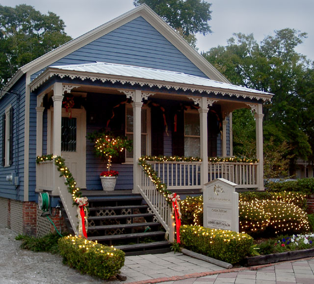 A multitude of twinkling lights festoons the Victorian Shotgun Cottage.