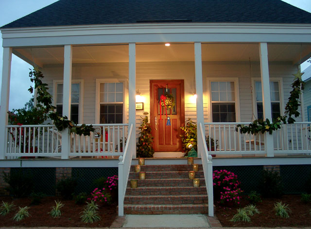 The Gulf Coast Cottage is decorated for Christmas with twinkling lights trimming the porch railings and picket fence.