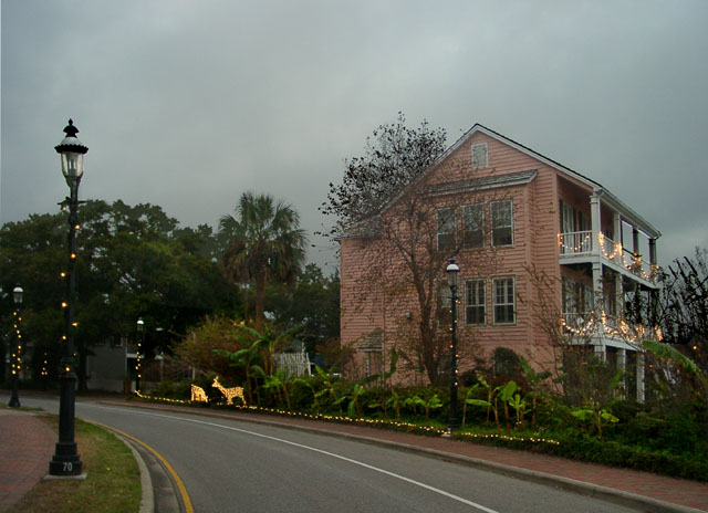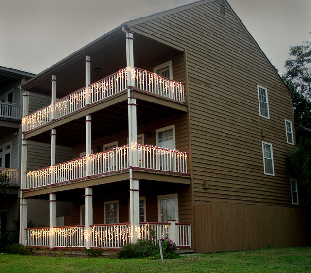 The multicolored lights are a spectacular accent to the colors of the Victorian shotgun.