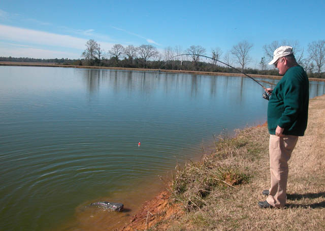 Mayor Bennie Barnes hooks a large catfish. He and Donnie Waters are planning a fish fry for Margorie Waters who is retiring from her job with the City of Century. It takes about an hour for the Mayor and Donnie to catch 20 fish.