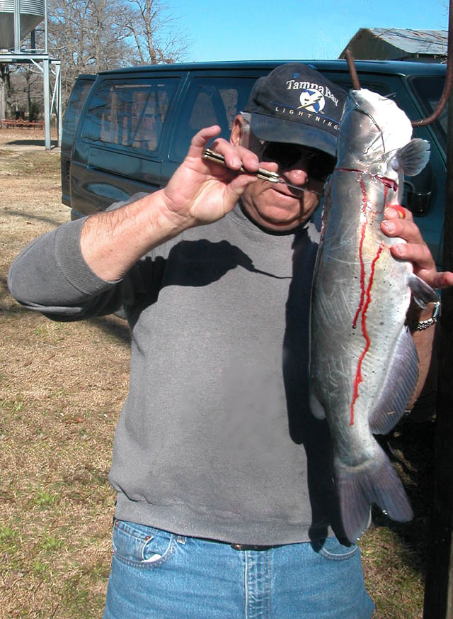 George Carpenter begins a demonstration of cleaning catfish by cutting off the spiny central fin.
