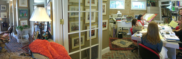 The work room on the right is adjacent to the gallery and sales area on the left.