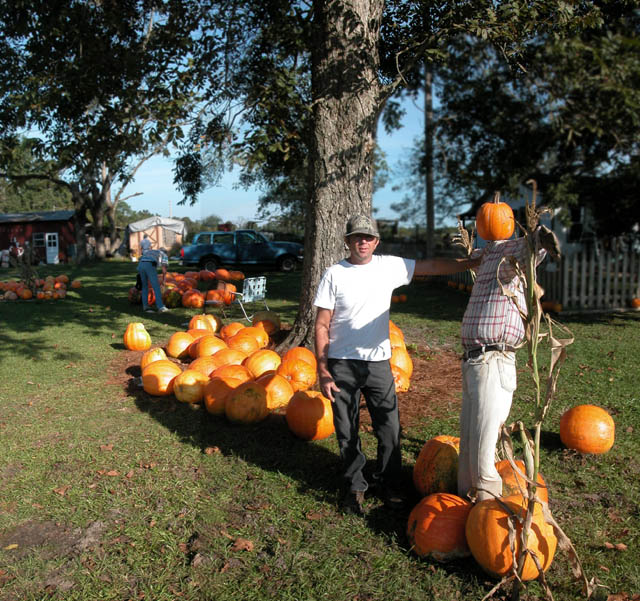 Stan Whitfield poises with his scarcrow near a pile of 60 pound pumpkins. -
