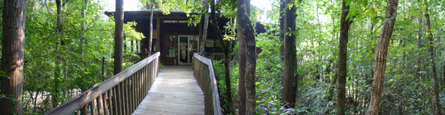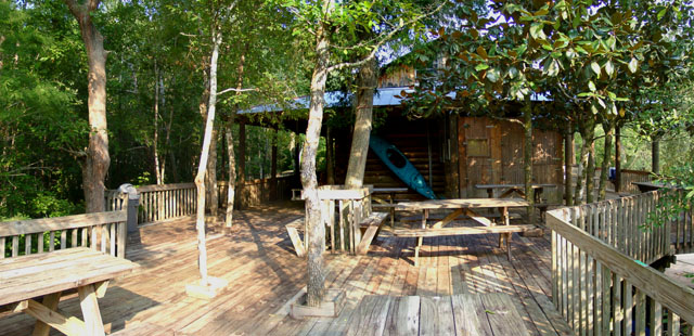 The camp store is perched over the Coldwater River swamp on piers. The walkway access can be seen above.