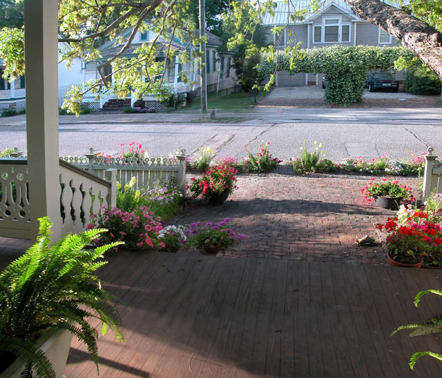 The term four-square refers to a floor plan with a broad central hallway with two rooms to either side. The rooms were large and square in proportion. Two back-to back fireplaces and a common chimney separated each pair of rooms. Porches were part of the social tradition in the days before air conditioning like an outside parlor. Along the streetscape, porches are aligned like one long room.