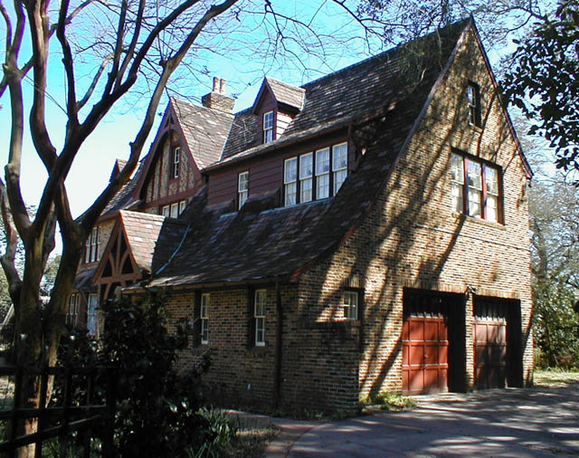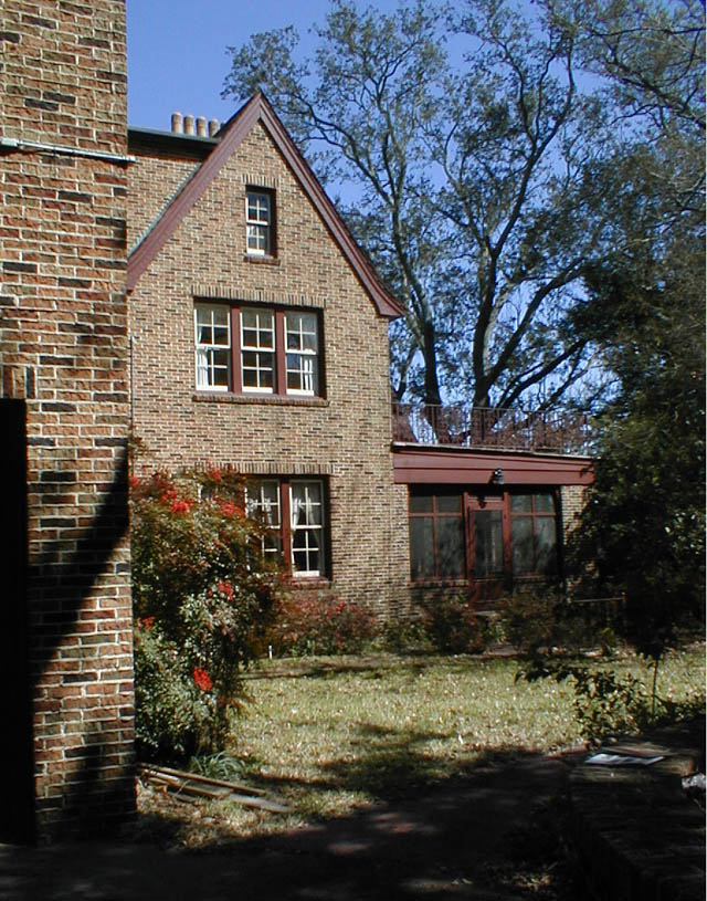 The property is framed by a brick retianing wall, softened by fragrant jasmine. Wide welcoming stairs that curve around a huge live oak lead up from the street.