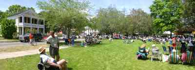 The west side of the square is flanked by museum buildings such as the Dorr House seen in the upper left corner. A crowd is gathered to hear musicians play at the annual Jazz Festival. -