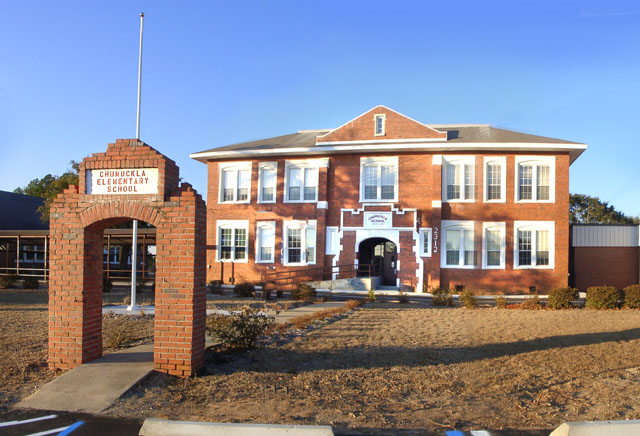 The wide, low-pitched gable surmounting the facade of the building in a classical style shows the federal influence. Units of stone are used to accentuate the corners of the building. The classical revival architectural style of the early 20th century can be seen even in the small community of Chumuckla.